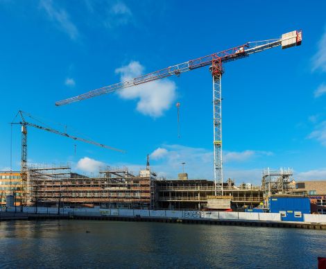 Blick auf die Rohbauarbeiten für den Umbau und die Erweiterung des ehemaligen Borchert-Theaters in Münsters Hafen.