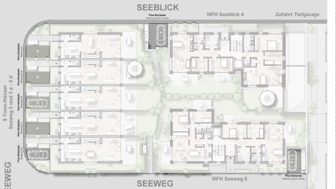 Die insgesamt 7 Außenstellplätze sind den jeweiligen Town-Häusern und den beiden barrierefreien Wohnungen im Erdgeschoss der Mehrfamilienhäuser zugeordnet - kurz und schnell sind so die jeweiligen Haus- und Wohnungseingänge erreichbar.